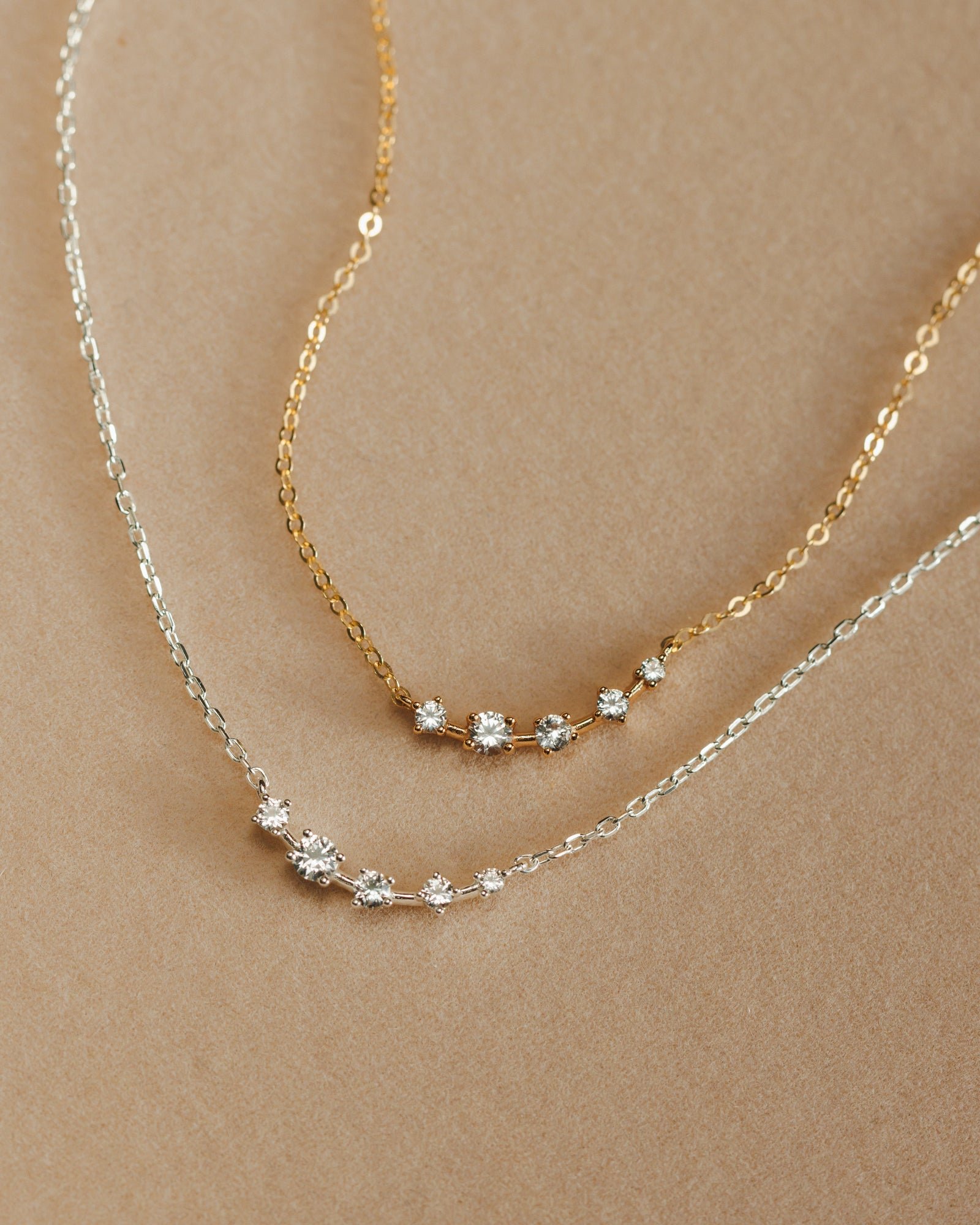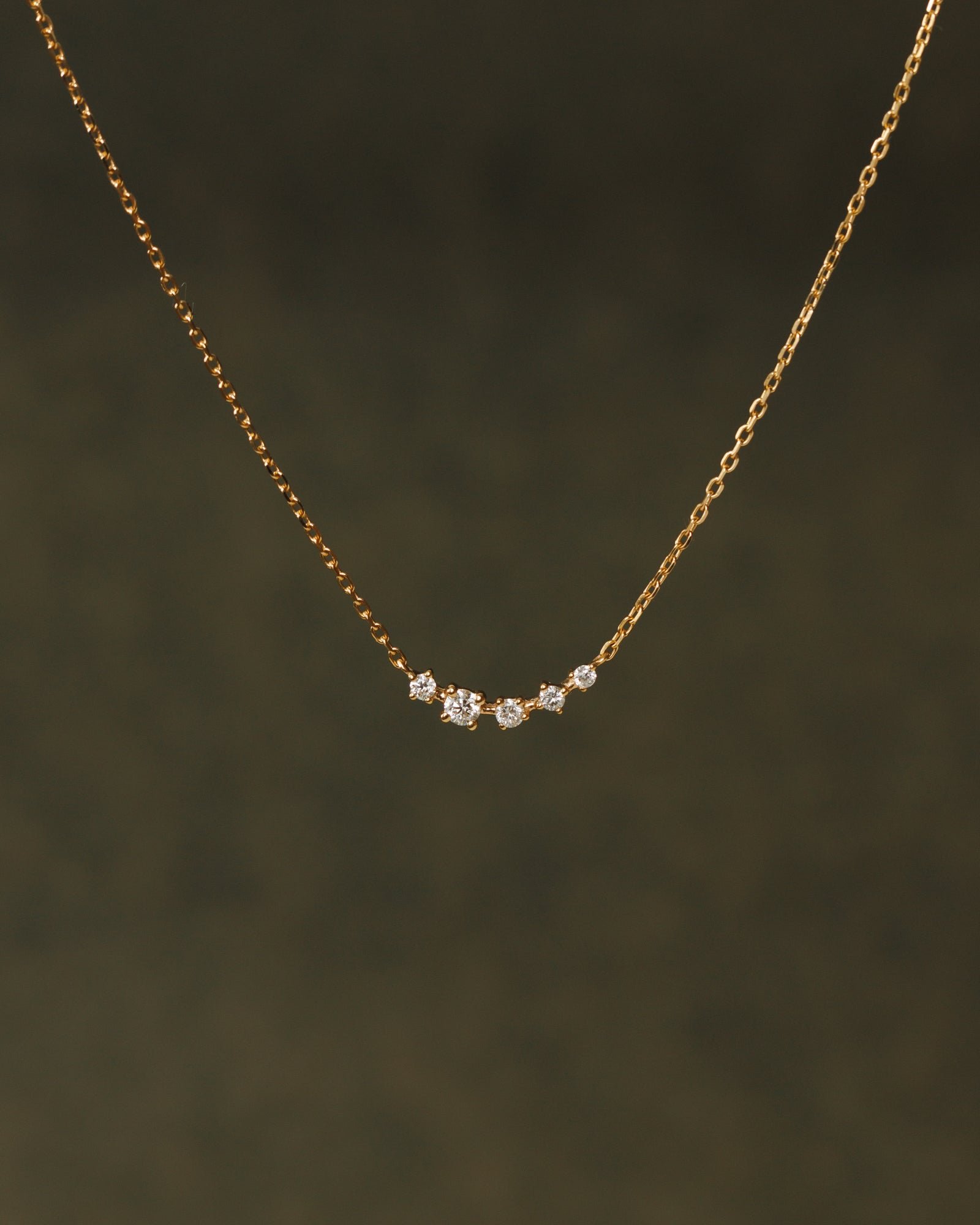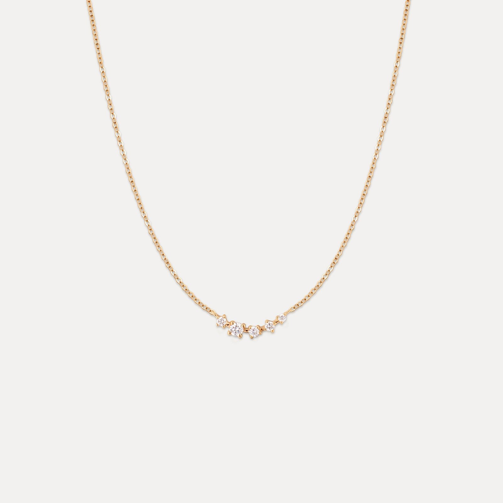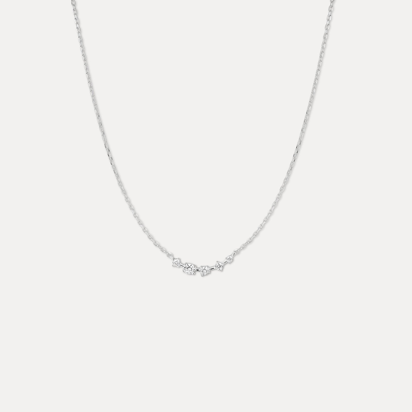Features a white sapphire-studded arc suspended on our sparkliest chain. Whimsical, yet wearable.